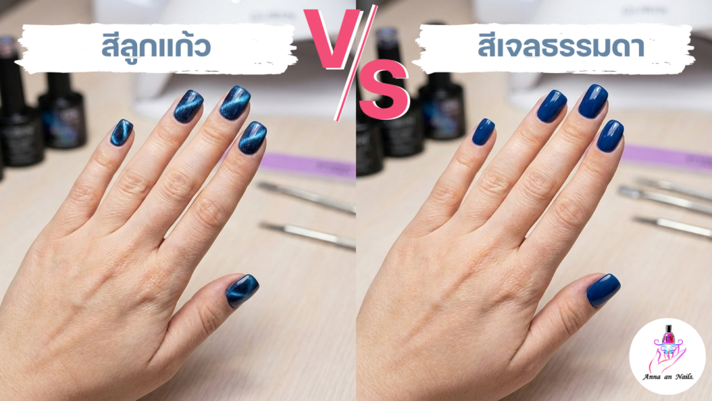 สีเจลธรรมดาจะเป็นสีที่ดูเรียบแบน (Flat) สวยแบบคลีนๆ แต่สีลูกแก้วจะให้ความรู้สึกที่ “ลึกและแพง” กว่ามาก เวลาเราขยับมือไปมา ลายในเล็บจะวิ่งตามแสงไฟ เหมือนเล็บเรามีชีวิตเลยล่ะค่ะ